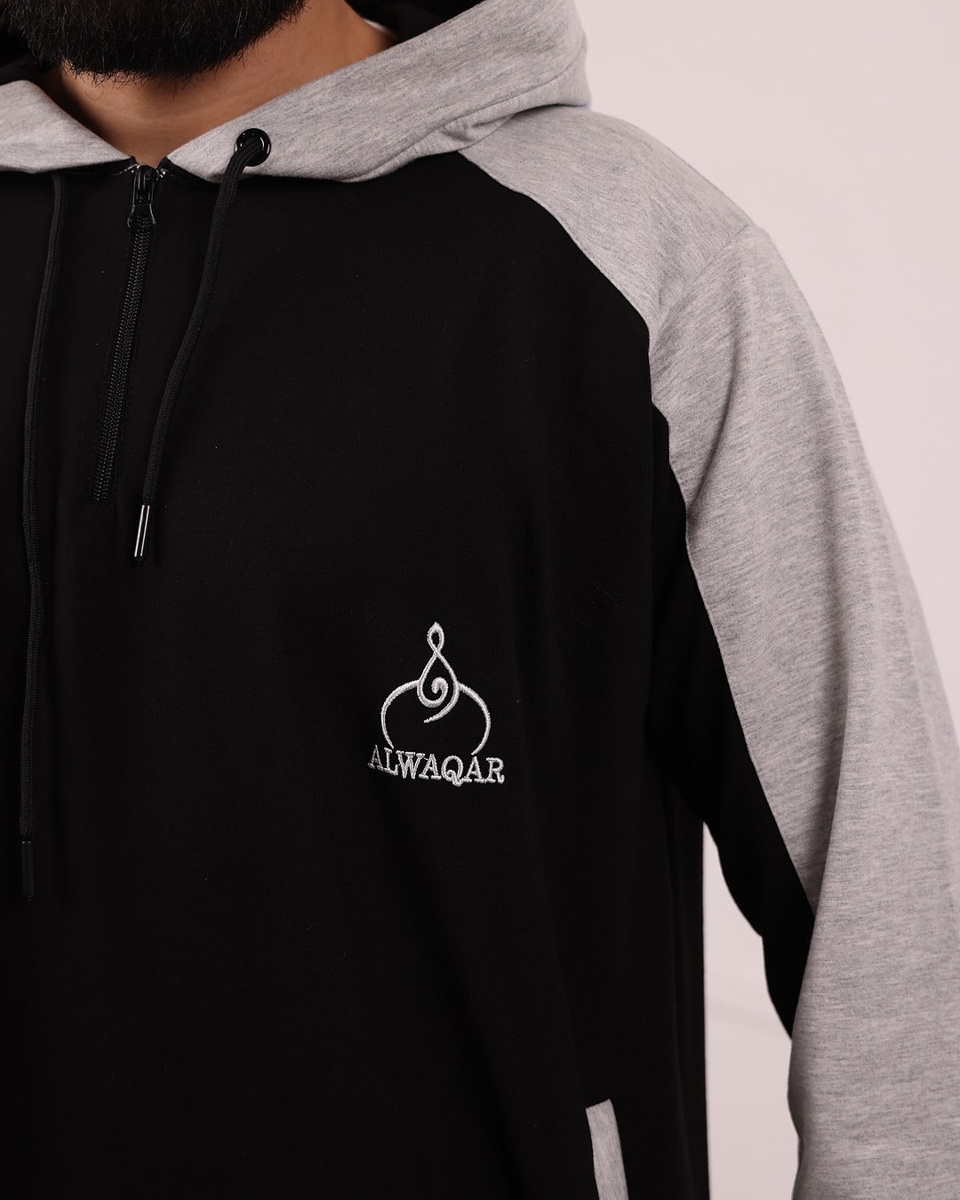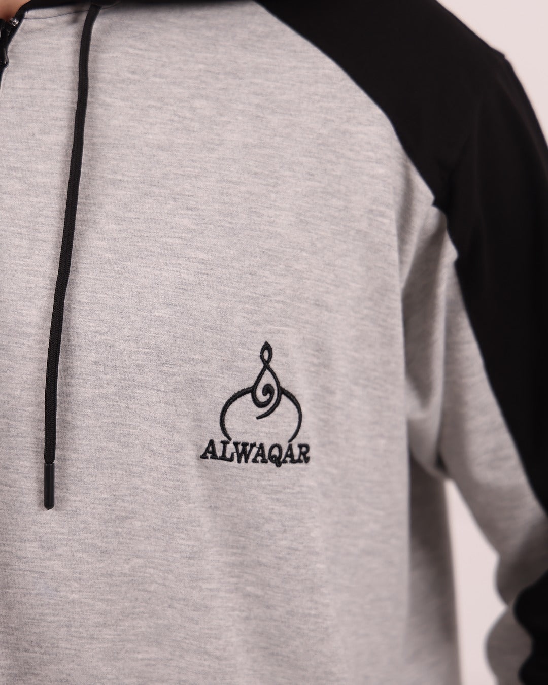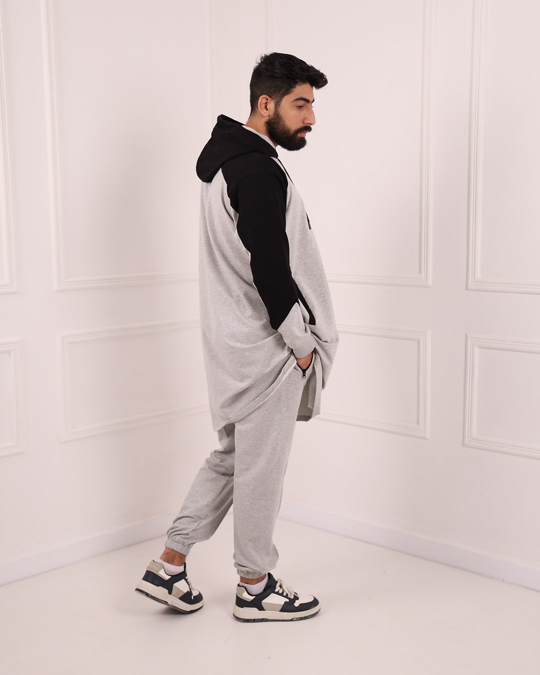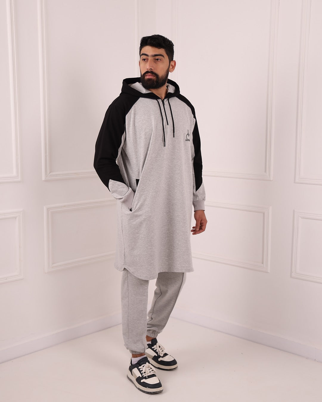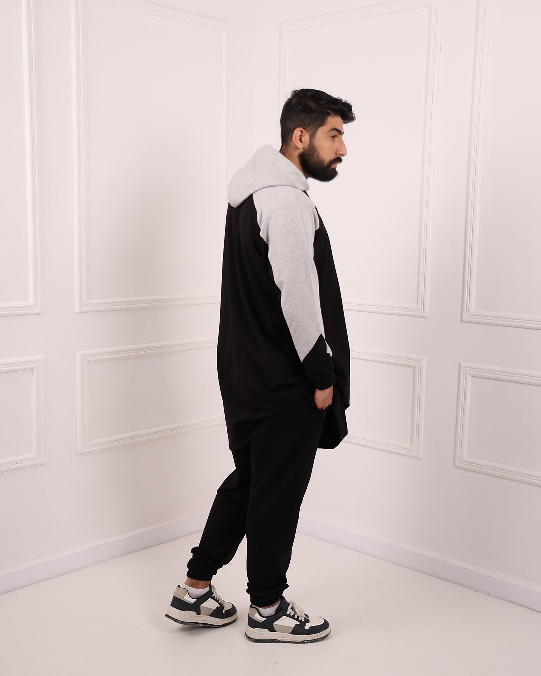 🔹 خامة مزدوجة فاخرة: الكُمّان رماديين فاتحين مع جسم أسود غامق كيعطي أناقة وبروز.
